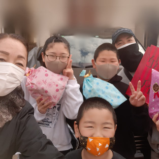 ◇バレンタインデー◇ 本日はチョコレートを渡しに 歩いて5分の、娘一家のお家までお出かけしました。 感染予防の為、玄関前で記念写真だけでおしまい。